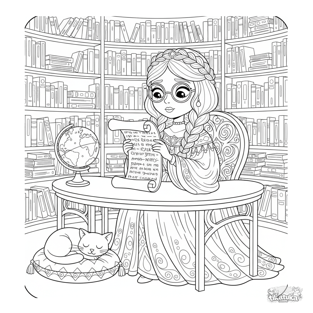 Página para colorear para mayores 10-12: una princesa erudita leyendo pergaminos antiguos en una biblioteca de torre. Estanterías detalladas, un globo y un gato dormido.