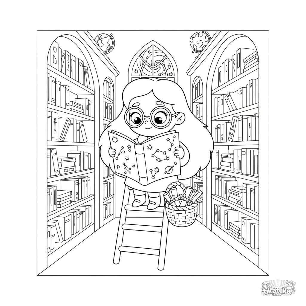 Página para colorear para niños 4-6: una princesa erudita con gafas lee un atlas gigante en una biblioteca antigua. Escena divertida en una escalera.