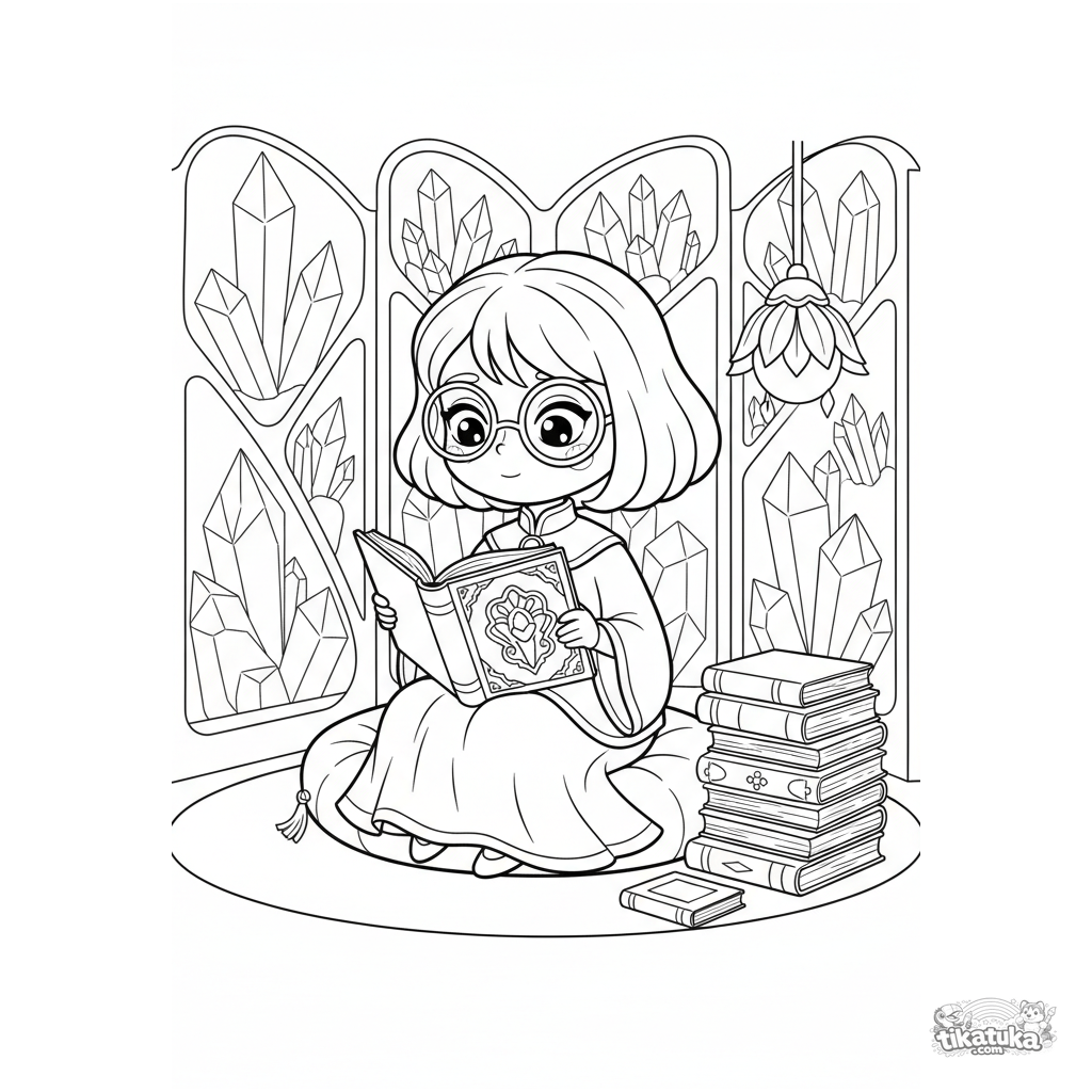 Página para colorear para niños 7-9: una princesa erudita con gafas lee un libro antiguo en una biblioteca de cristal mágica. Ambiente reflexivo.
