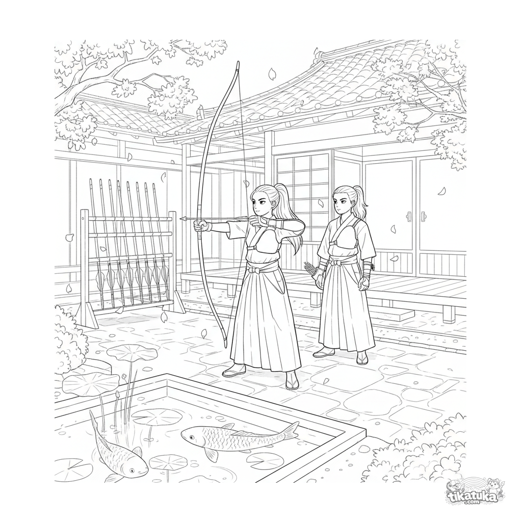 Página para colorear anime detallada: miembros del club escolar de kyudo practican en el patio de piedra de un dojo tradicional. Escena con estanque de koi, estantes de arcos y pétalos de cerezo para 10-12 años.