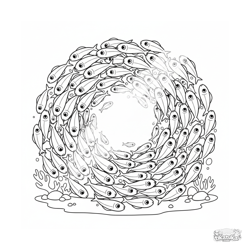 Página para colorear estilo papel cortado: un banco de peces plateados girando en un rayo de sol en aguas poco profundas. Para niños de 7 a 9 años.