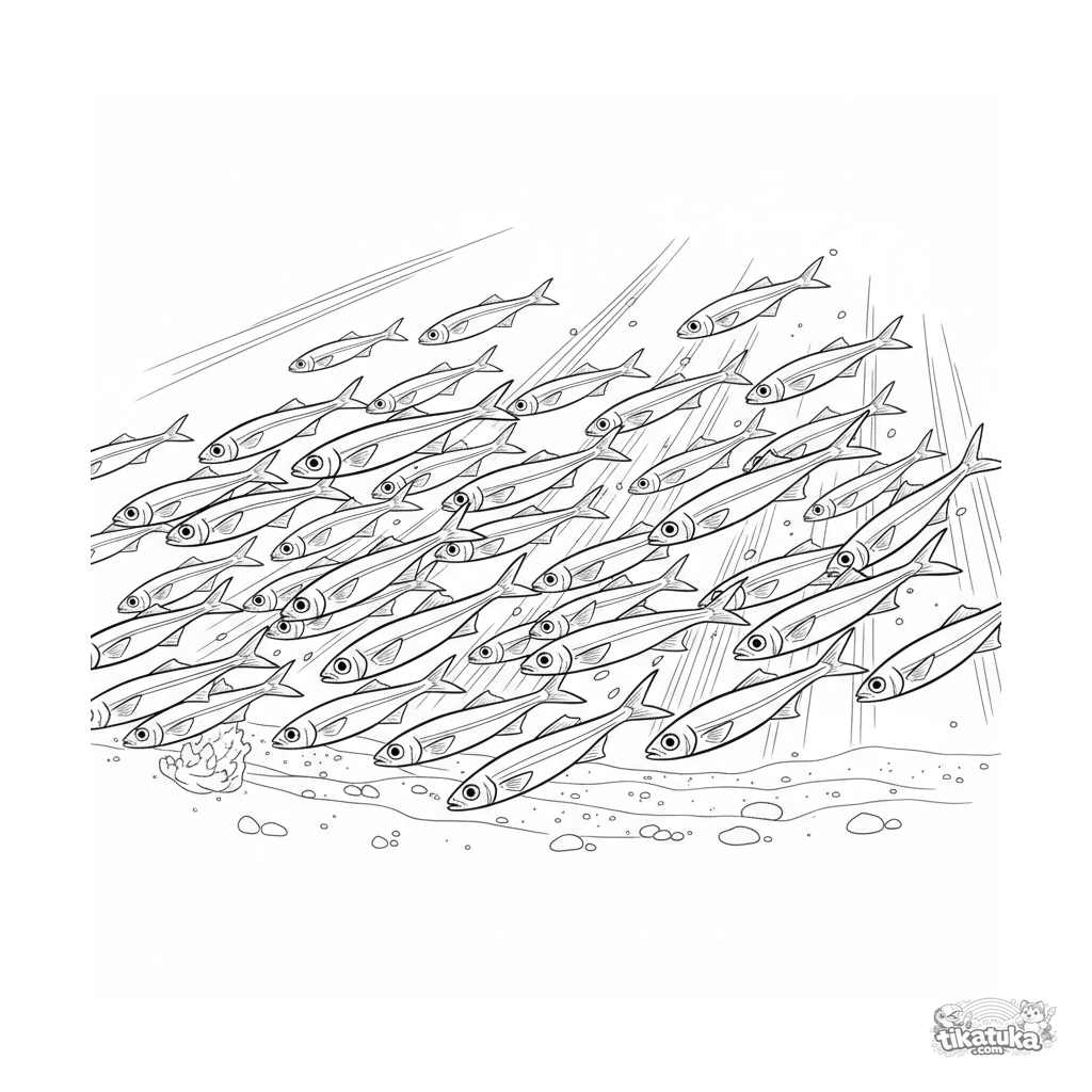 Página para colorear de un gran banco de pequeños pejerreyes nadando a través de un rayo de sol en aguas poco profundas. Para niños de 4 a 6 años.