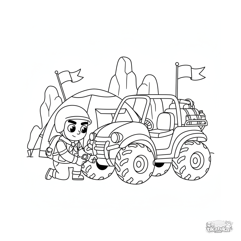 Página para colorear de un ATV de exploración cerca de la tienda de mando. Para niños de 7 a 9 años. Incluye ATV con ruedas grandes, explorador revisando presión, mochila y cantimplora.