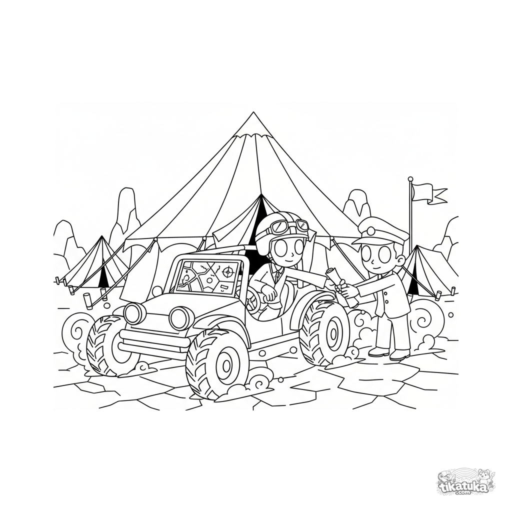 Página para colorear para niños 7-9: un buggy de exploración llegando urgentemente a un cuartel de campaña. Escena dinámica con entrega de informe, mapa y marcas de neumáticos.