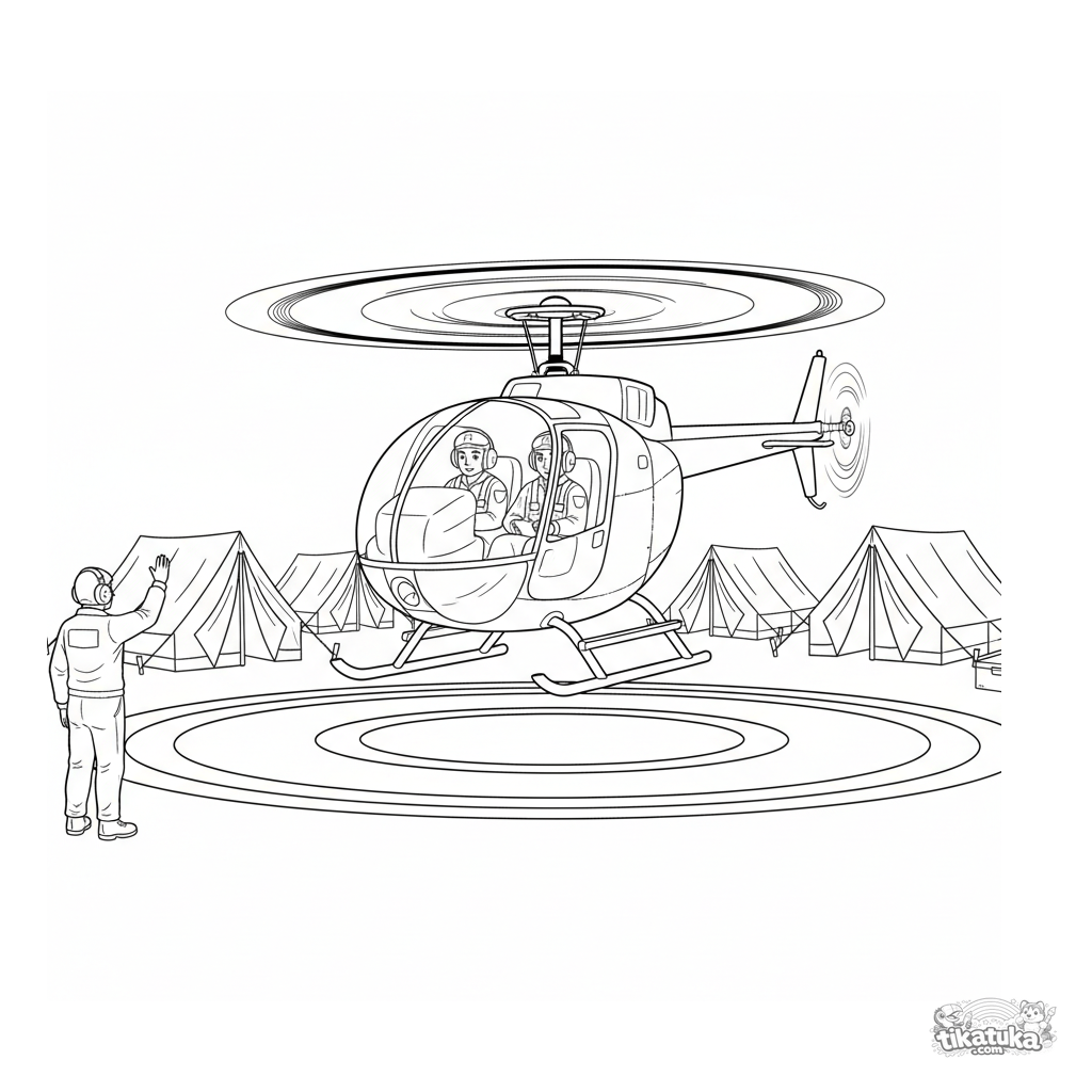 Página para colorear detallada para 10-12 años: un helicóptero de exploración aterrizando cerca de un cuartel general de campaña. Contornos nítidos, proporciones realistas, escena con personal.