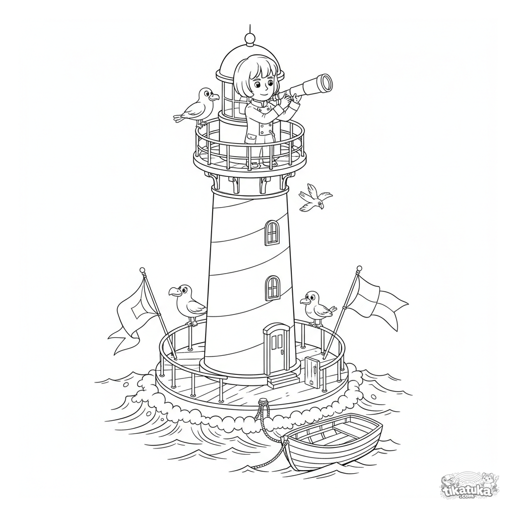 Página para colorear de un faro marino en plataforma flotante estilo plano técnico para 10-12 años. Detalles: mirador, telescopio, banderas.