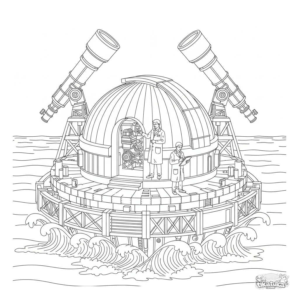 Página para colorear de un observatorio marino en una plataforma flotante para 10-12 años. Imagen detallada de una cúpula, telescopios y científicos.