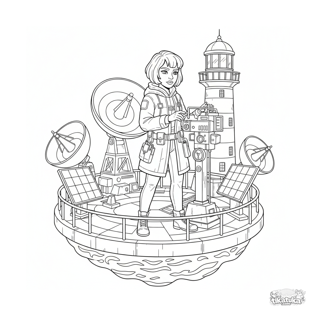 Página para colorear detallada para 10-12 años: un científico trabaja en una plataforma de observatorio marino flotante con un faro, antenas parabólicas e instrumentos científicos.