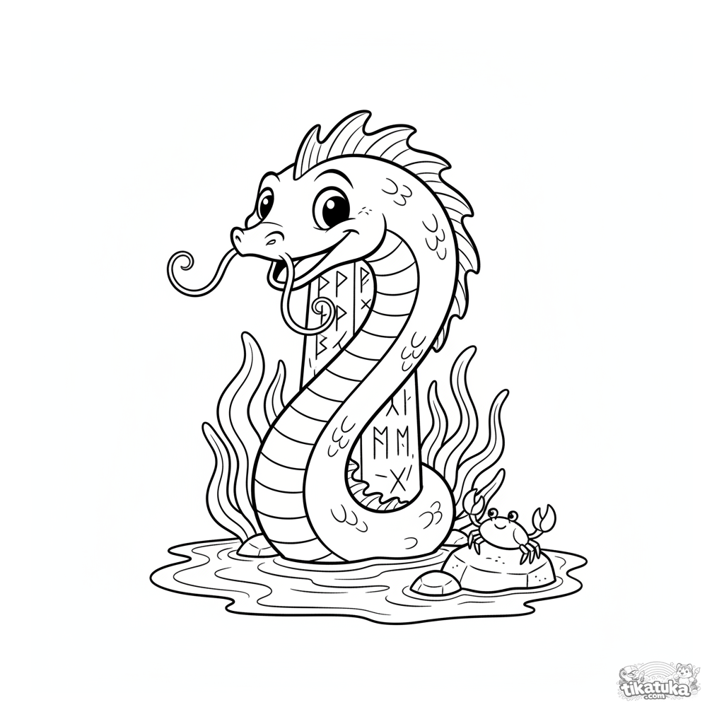 Página para colorear para preadolescentes de 7-9 años: una amigable serpiente marina se enrosca alrededor de un monolito con runas en una charca poco profunda. Pose dinámica, detalles moderados, una escena con tema acuático para colorear.