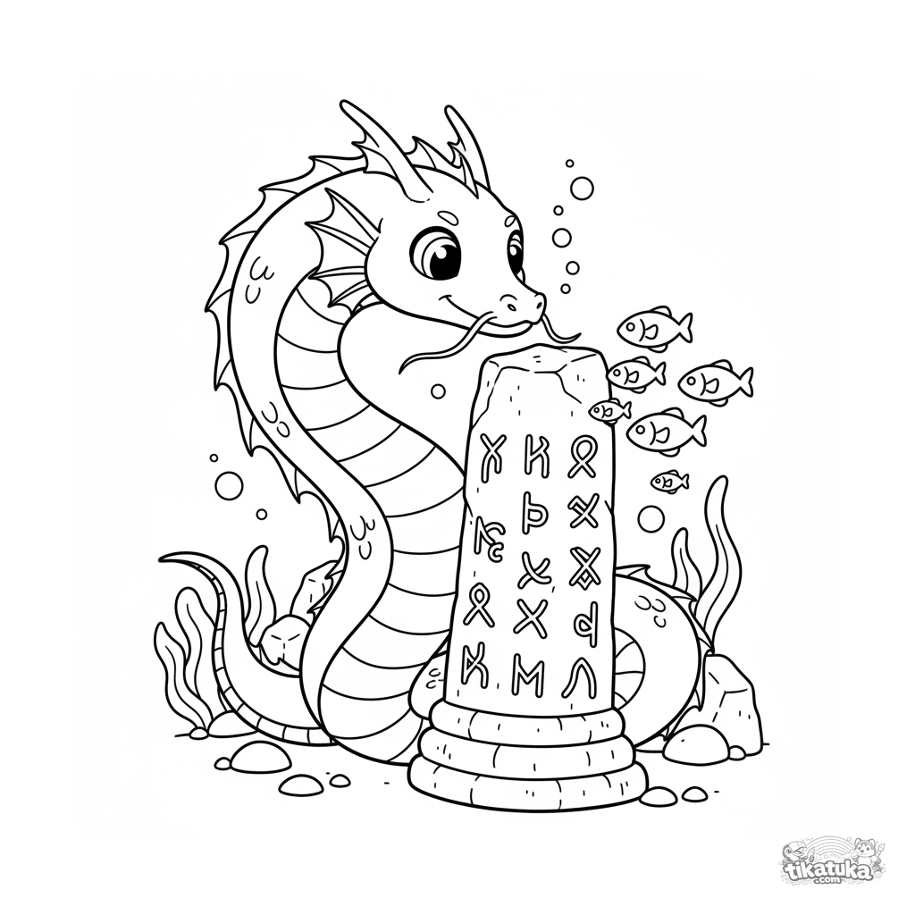 Página para colorear para niños de 4 a 6 años: una serpiente marina amigable juega alrededor de un pilar rúnico sumergido. Formas claras, fondo moderado.