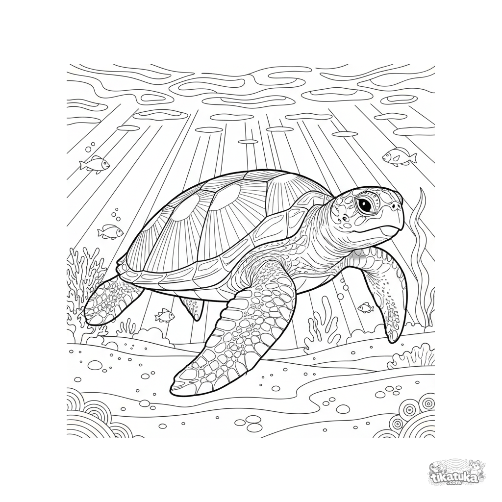 Página para colorear de una tortuga marina nadando en aguas poco profundas iluminadas por el sol. Para 10-12 años, imagen detallada con arena y patrones de luz.