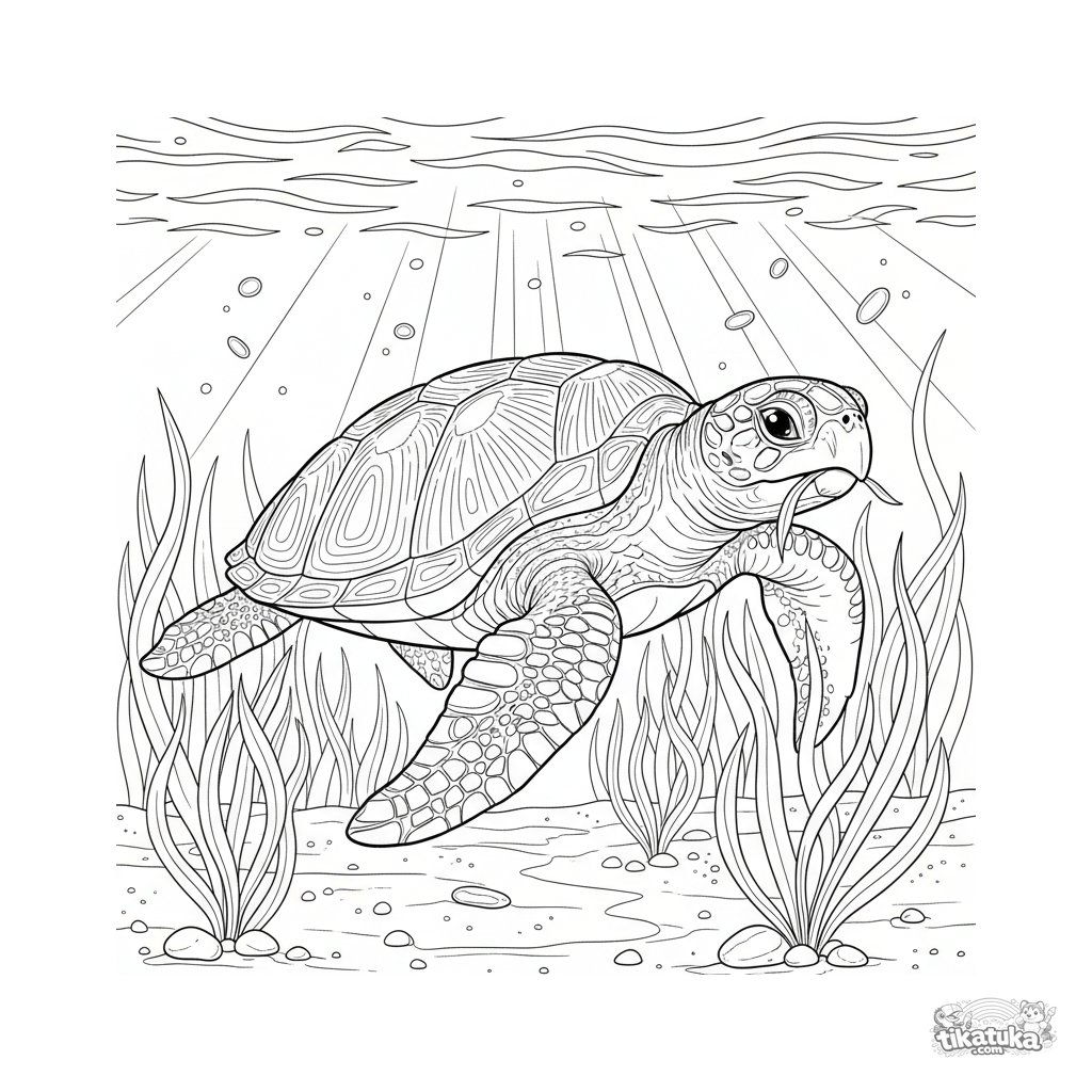 Página para colorear de una tortuga marina pastando pacíficamente en aguas poco profundas iluminadas por el sol entre pasto marino.
