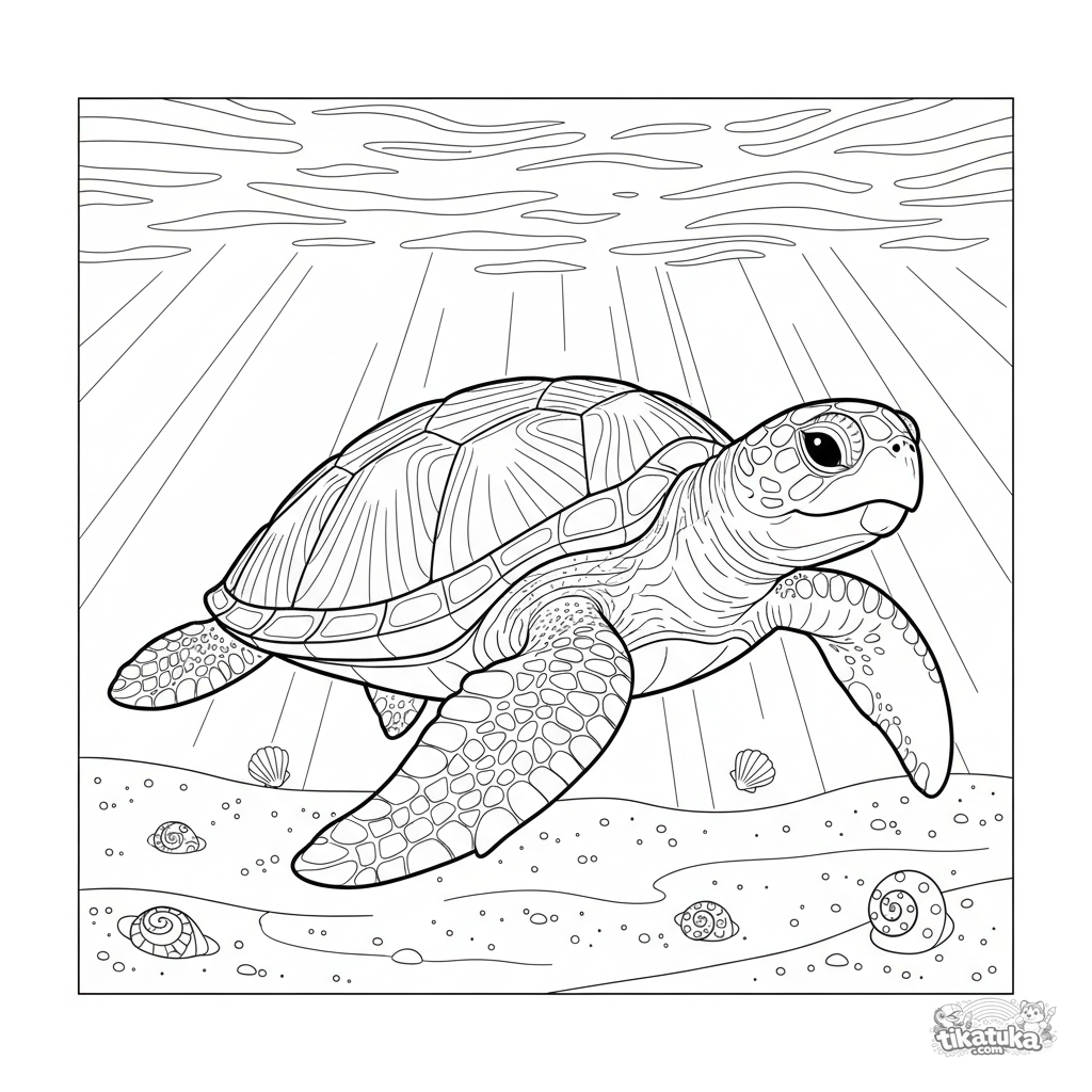 Página para colorear de una tortuga marina deslizándose por aguas poco profundas bañadas por el sol. Para 10-12 años. Ilustración detallada estilo guía de campo.