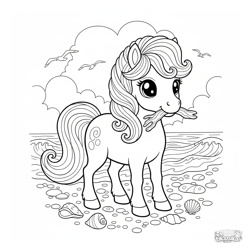 Página para colorear de un poni mágico de espuma marina recolectando madera a la deriva en una playa brumosa. Para niñas de 4-6 años, escena marina tranquila.