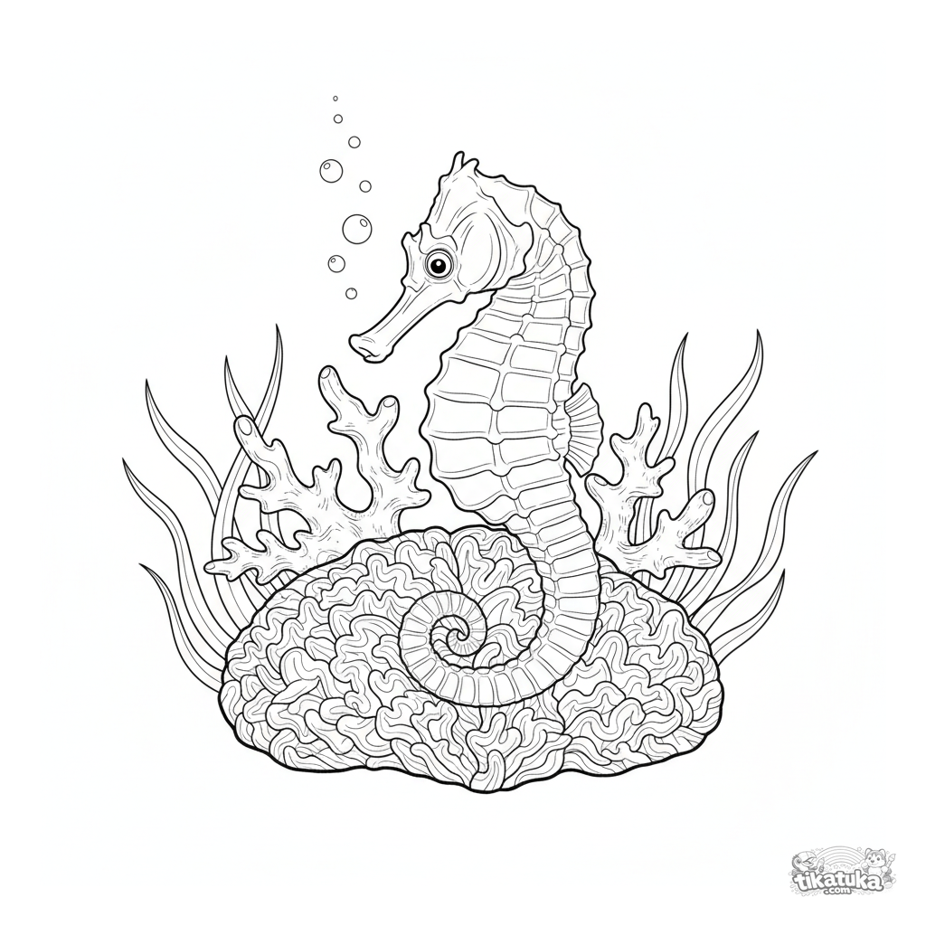 Página para colorear del mundo submarino para niños de 7 a 12 años. Un caballito de mar se enrosca en una rama de coral cerebro, con algas y burbujas.