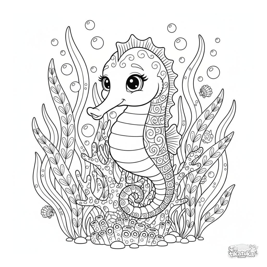 Página detallada para colorear un caballito de mar para niños de 7 a 12 años. Muestra un caballito de mar enroscado en un coral en un bosque submarino de algas con burbujas flotantes.
