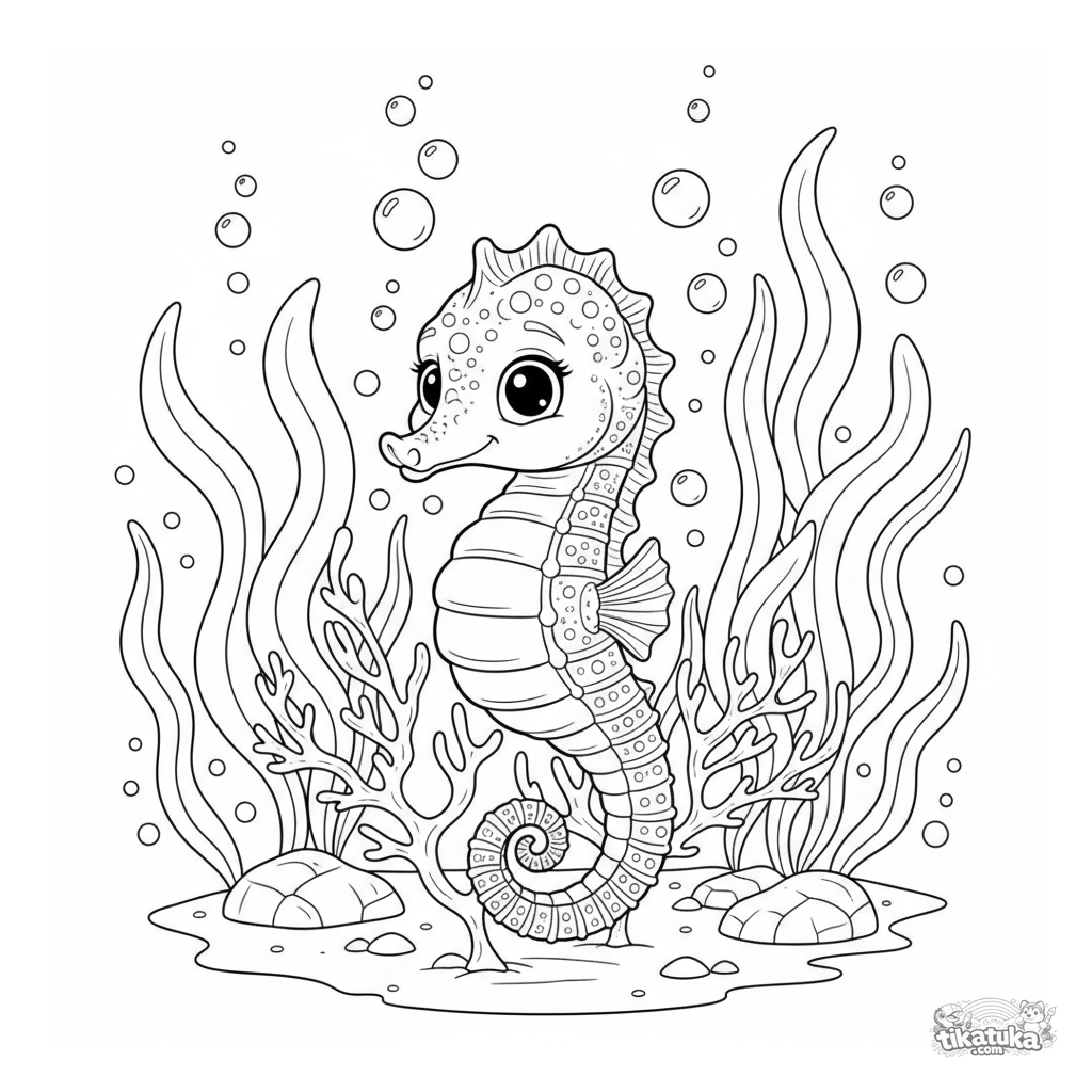Página detallada para colorear de un caballito de mar en un bosque submarino de algas para niños de 7 a 12 años. La escena incluye coral, burbujas y líneas fluidas.