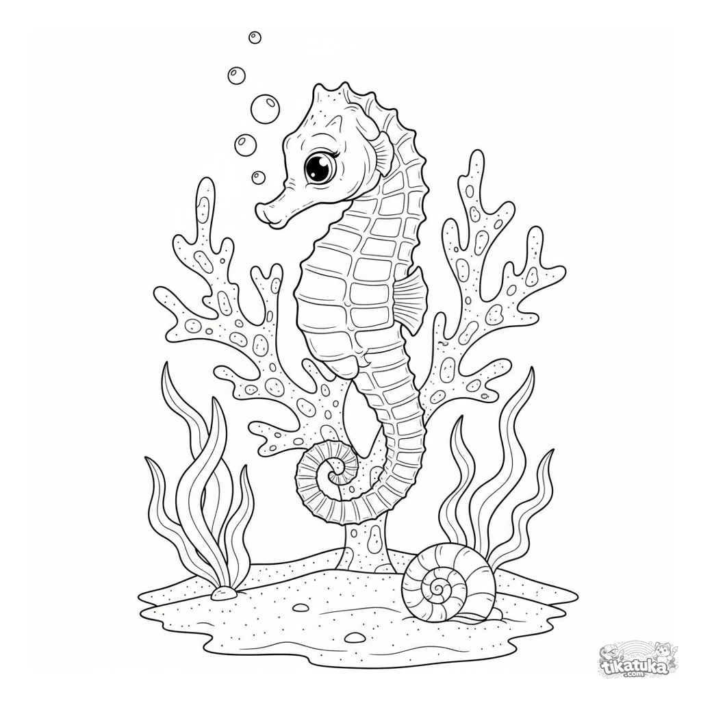 Página para colorear para niños mayores 7-12 años: un caballito de mar detallado se enrosca en coral en un jardín submarino.
