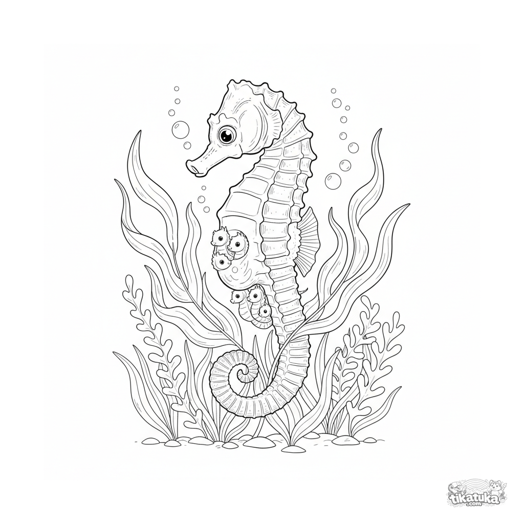 Página para colorear detallada de un caballito de mar padre llevando bebés en un jardín de algas soleado. Para 10-12 años.