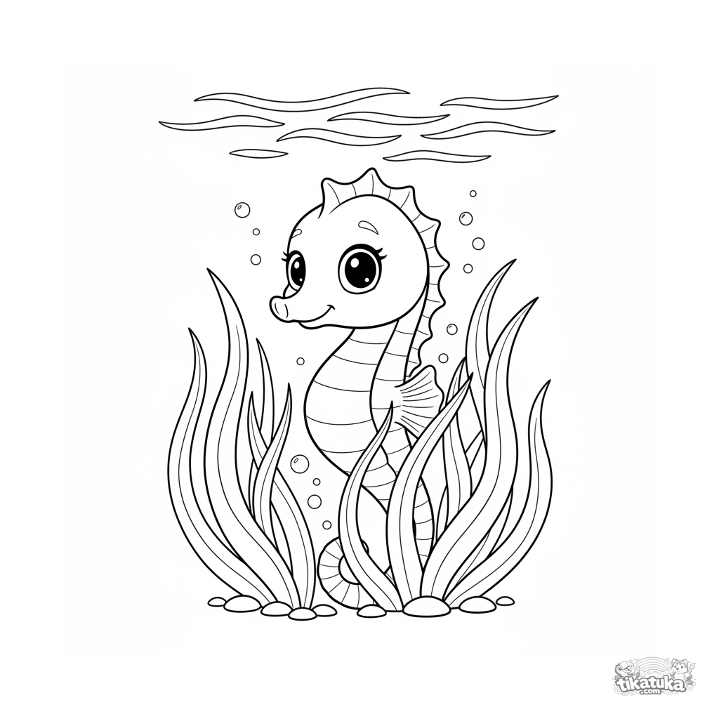 Página para colorear de un caballito de mar escondido en algas en aguas poco profundas y soleadas. Ideal para niños de 4 a 6 años.