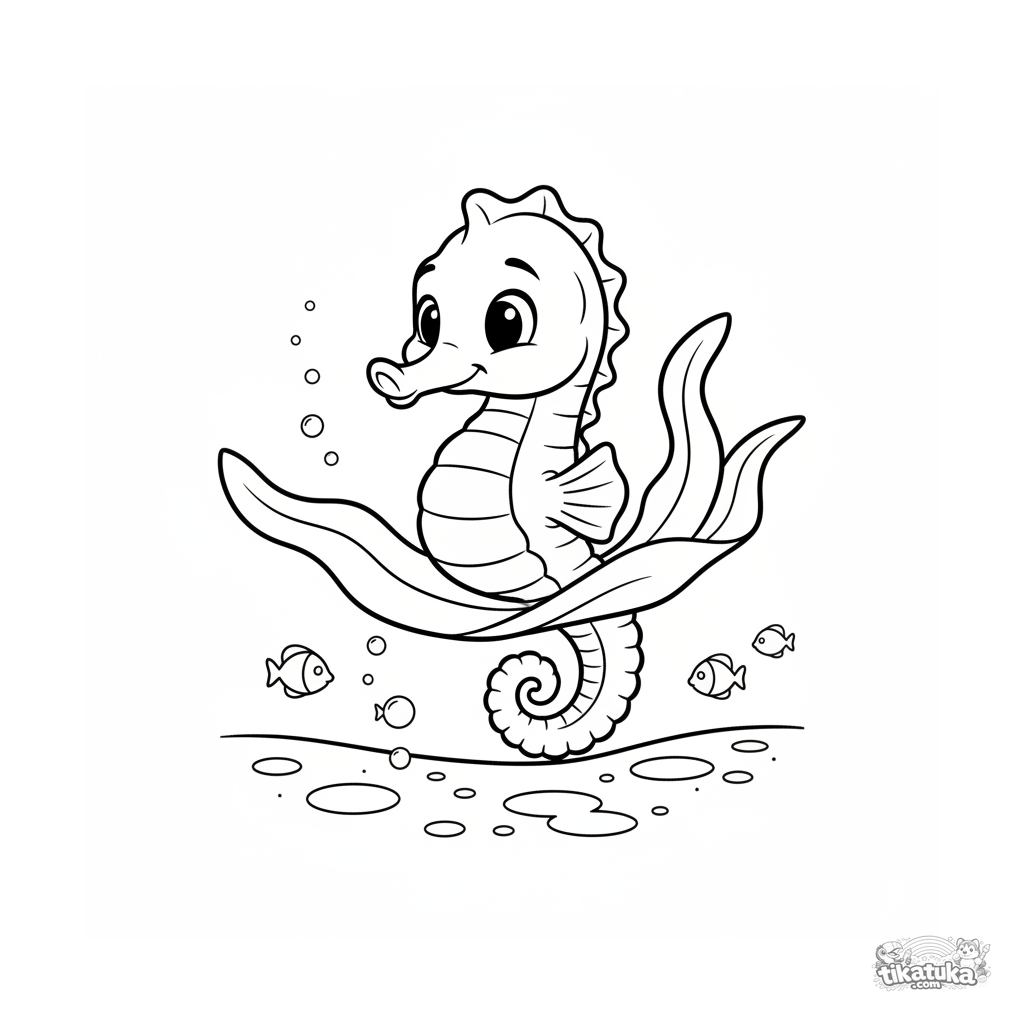 Página para colorear para 7-9 años: un caballito de mar viaja en un alga en aguas poco profundas soleadas. Ilustración al estilo animación clásica Disney.