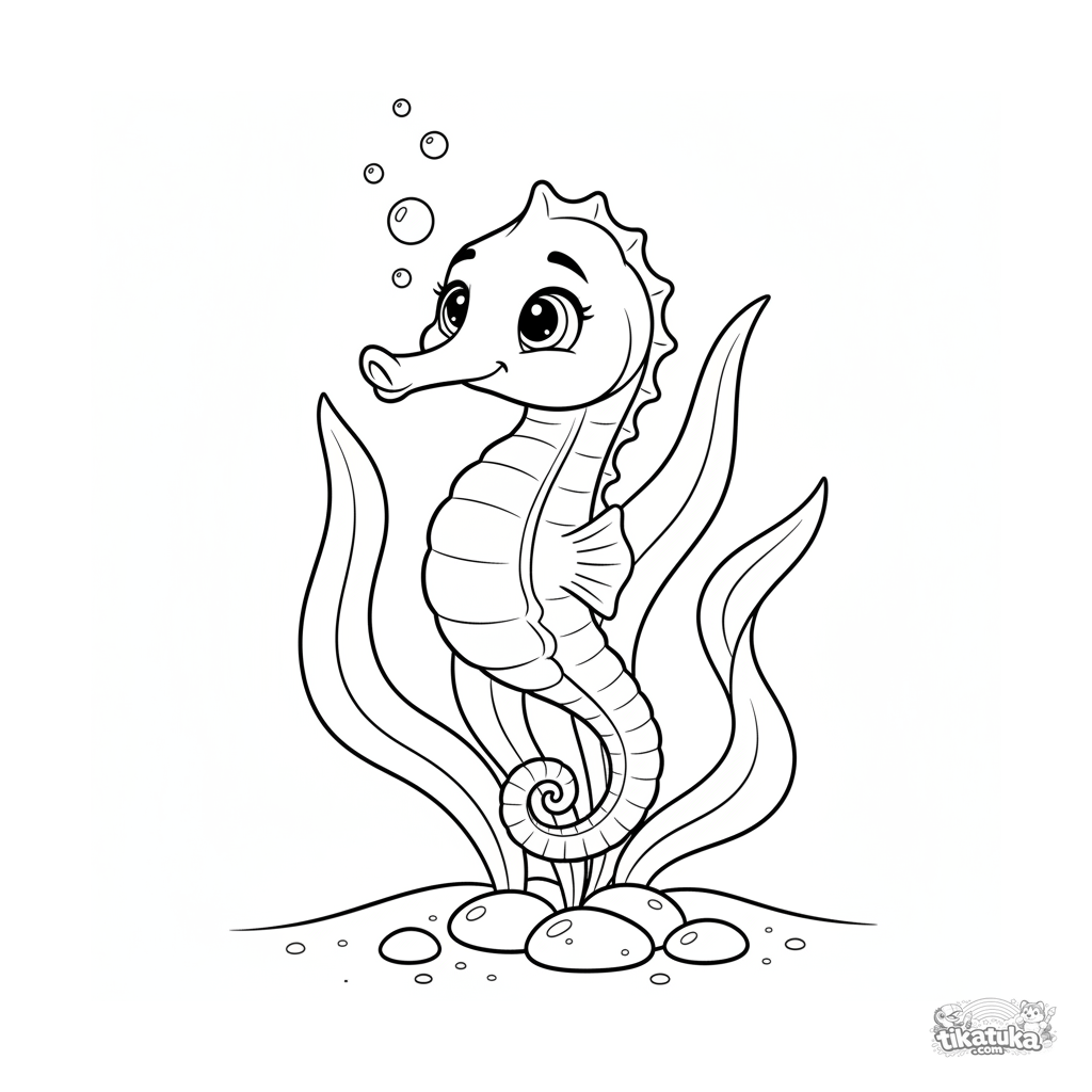 Página para colorear de un caballito de mar en alga flotante en aguas poco profundas y soleadas. Para niños de 4 a 6 años.