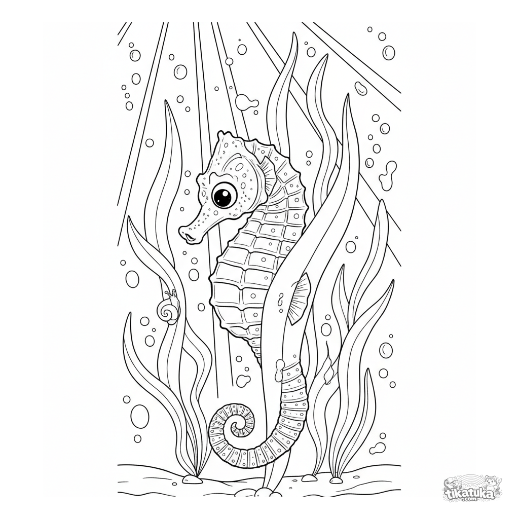 Página detallada para colorear de un caballito de mar aferrado a las algas en un bosque submarino iluminado por el sol en aguas poco profundas.