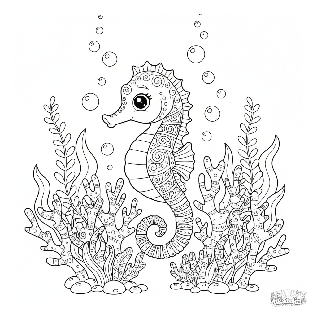 Página para colorear para niños mayores 7-12: un caballito de mar nadando por un arrecife de coral colorido. Alto detalle, estilo cartoon, escena submarina.