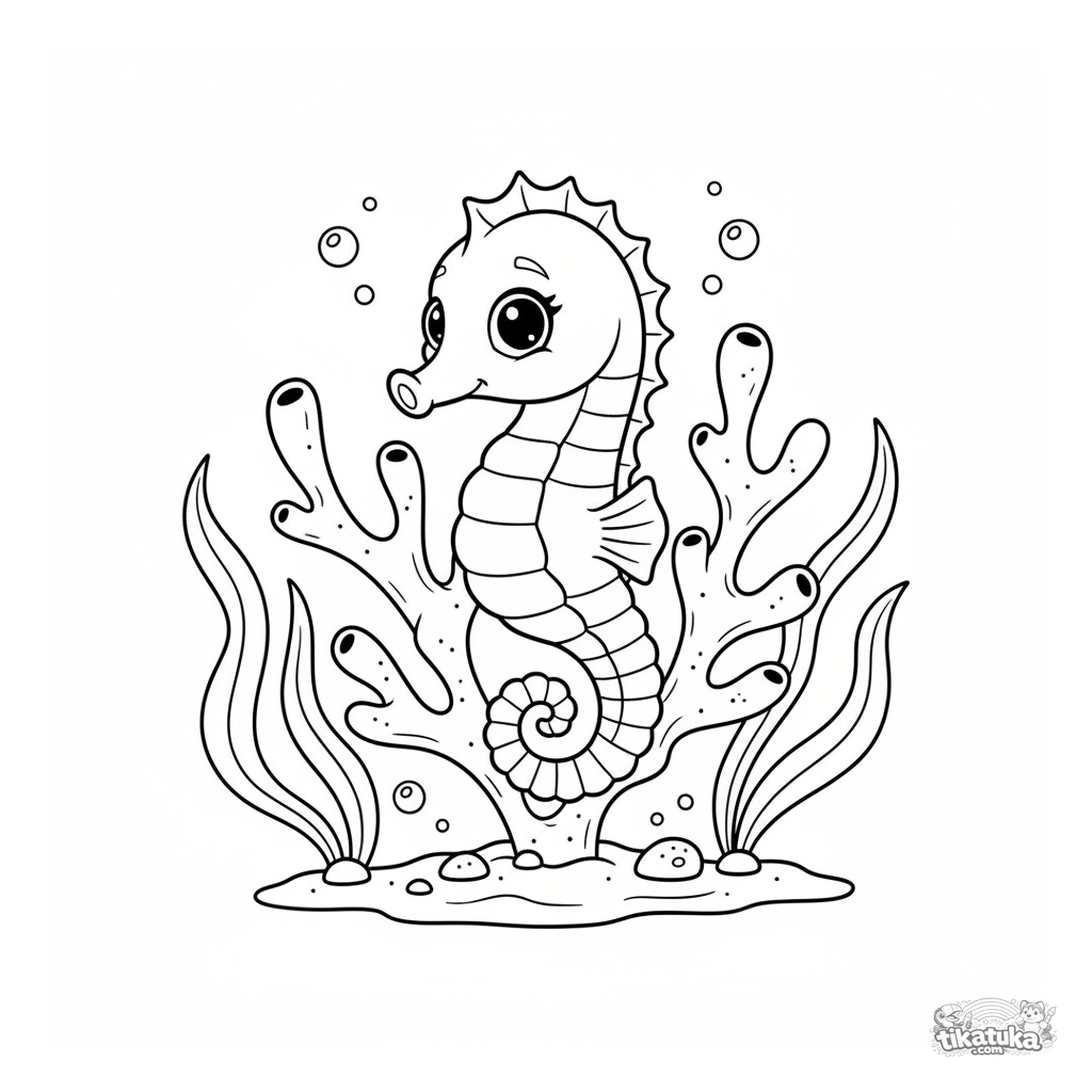 Página para colorear de un caballito de mar girando alrededor del coral en un mundo submarino. Para niños de 4 a 6 años. Con burbujas y algas.