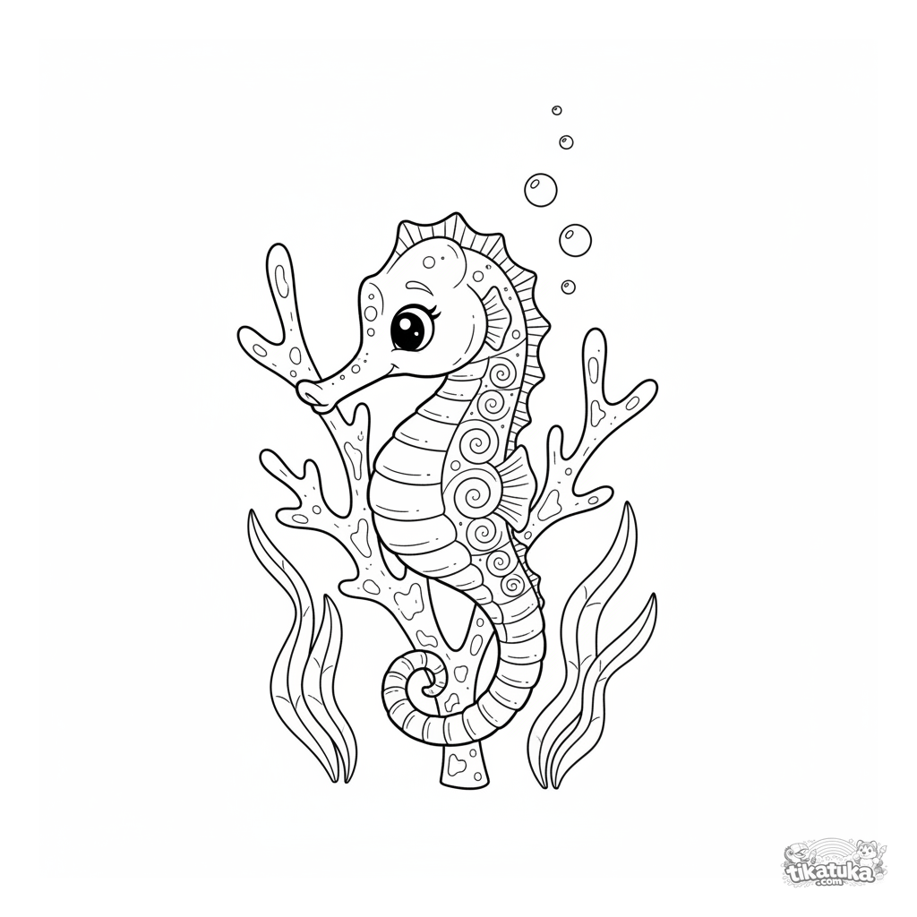 Página para colorear para niños 7-12: un caballito de mar detallado con su cola envuelta alrededor de una rama de coral. Fondo submarino con algas y burbujas, líneas intrincadas.