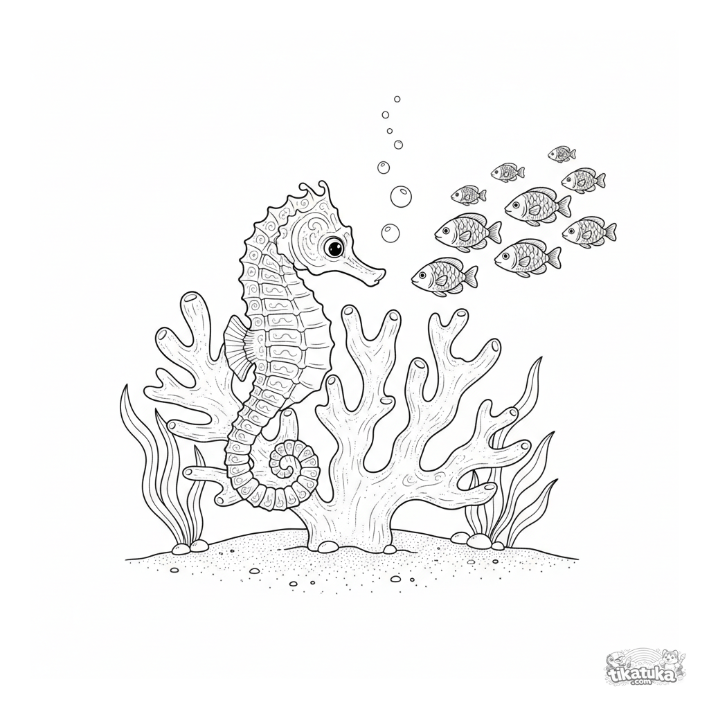 Página detallada para colorear para niños de 7-12 años con un caballito de mar. La criatura marina enroscada en coral entre peces y algas.