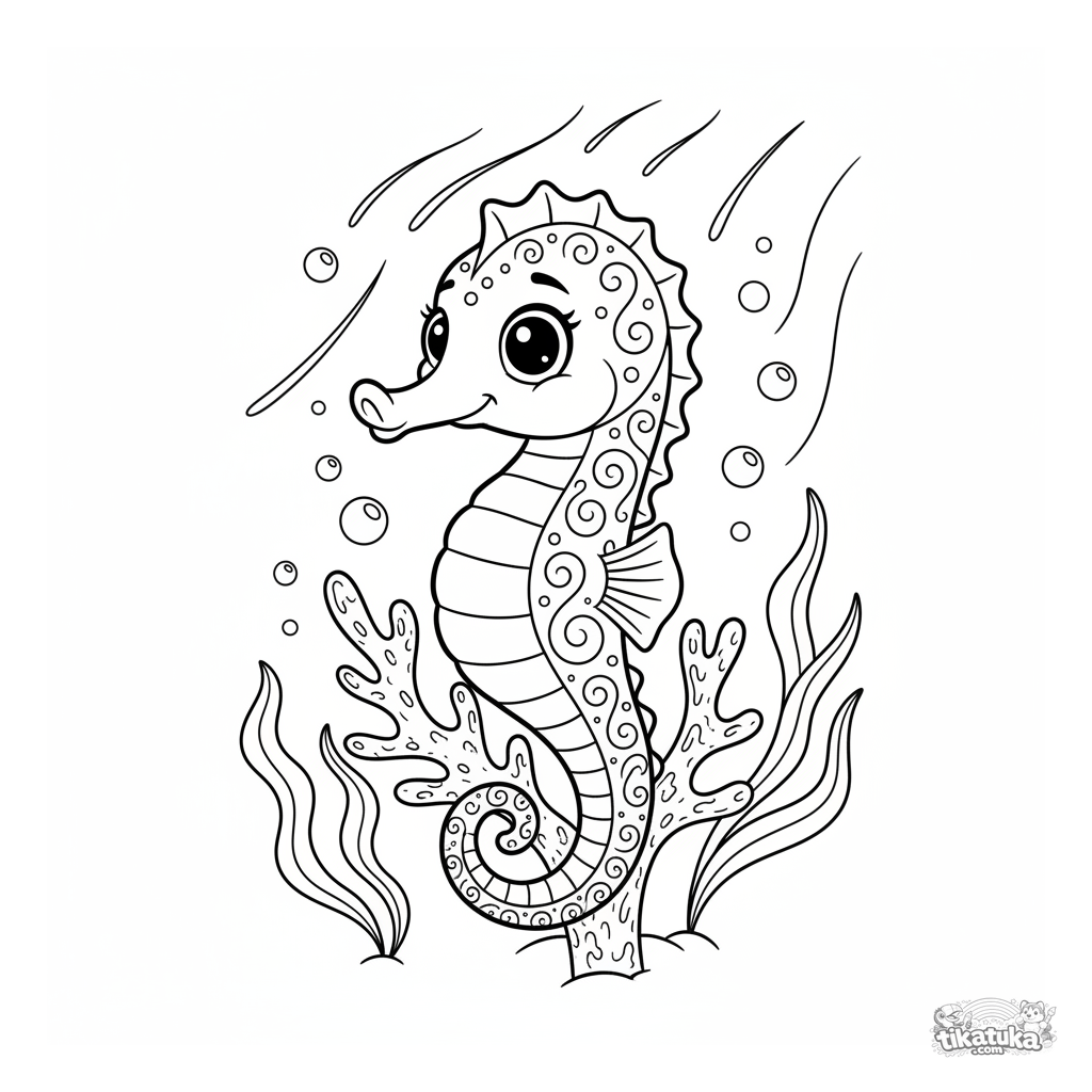 Página para colorear para niños 4-6: un lindo caballito de mar envuelve su cola alrededor de una rama de coral en un mundo submarino soleado. Detalle moderado, estilo amigable.