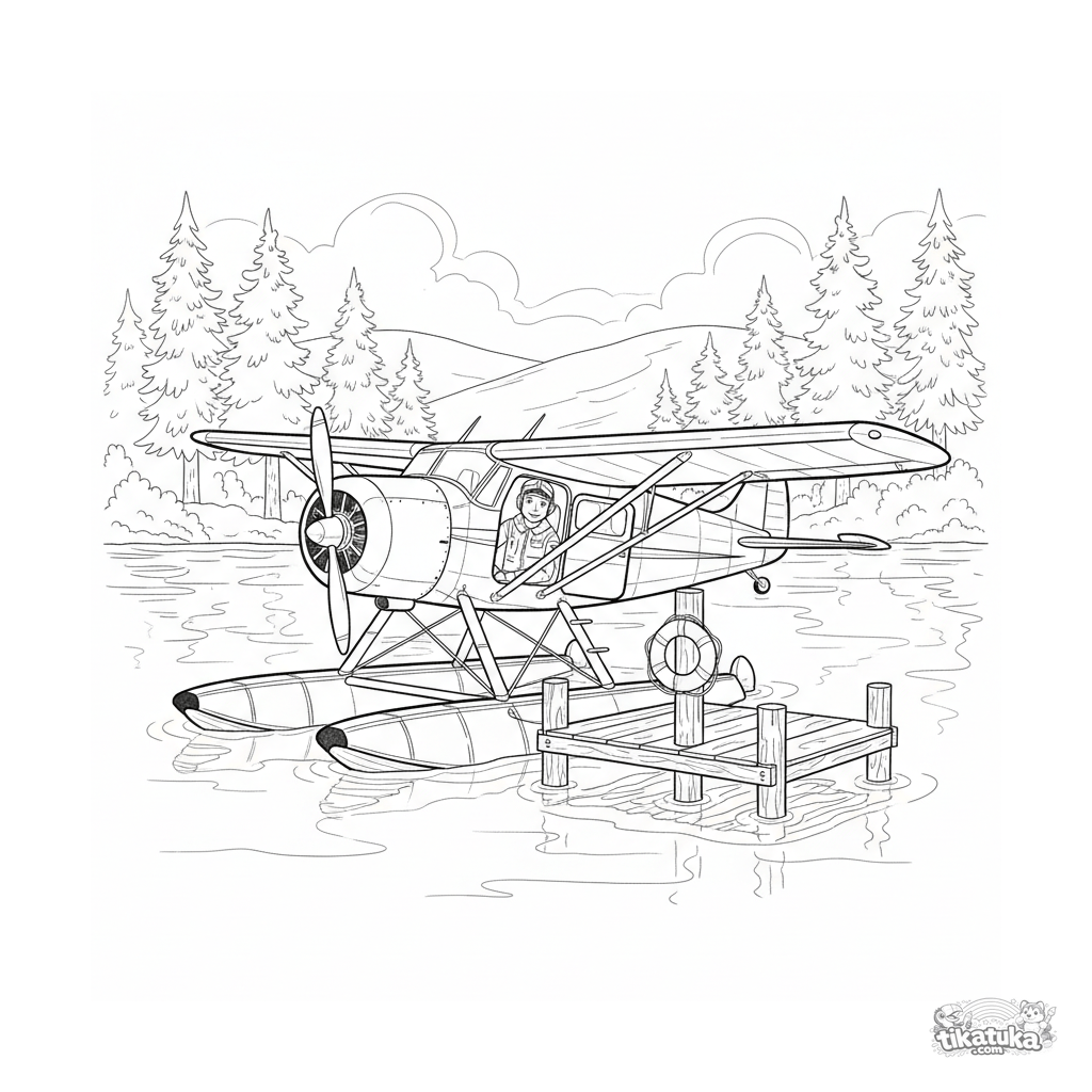 Página para colorear detallada para niños mayores de 10-12 años: un hidroavión atracado en un muelle de madera en un lago tranquilo. Detalles del avión, muelle y reflejos.