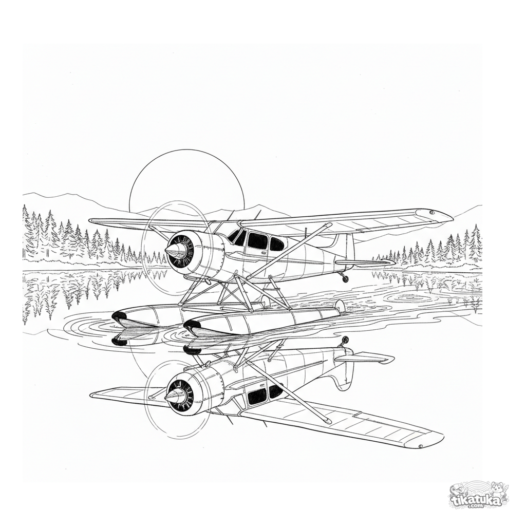 Página para colorear de un hidroavión deslizándose por la superficie tranquila de un lago de montaña al atardecer. Escena detallada con reflejos y pinos. Para 10-12 años.