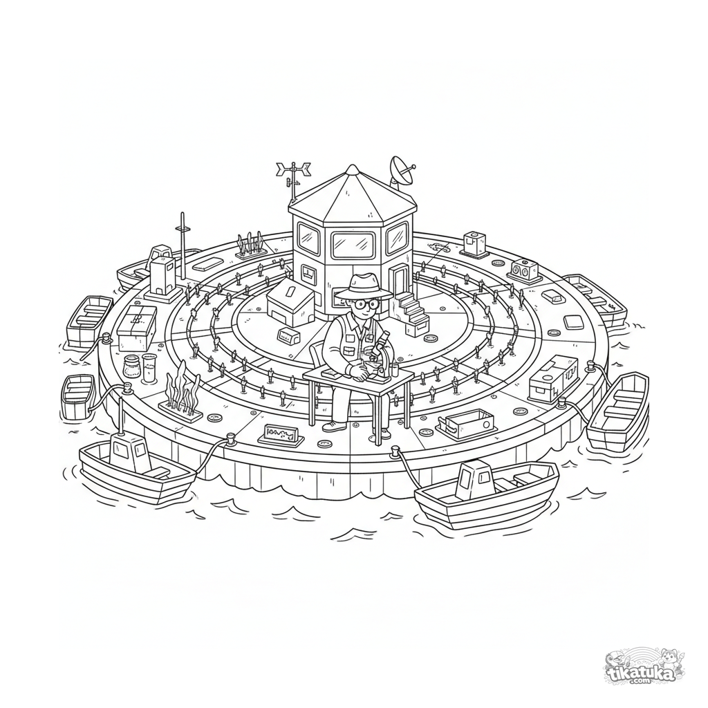 Página compleja para colorear de una plataforma científica de algas en el mar para 10-12 años. Muchos detalles: anillos, instrumentos.