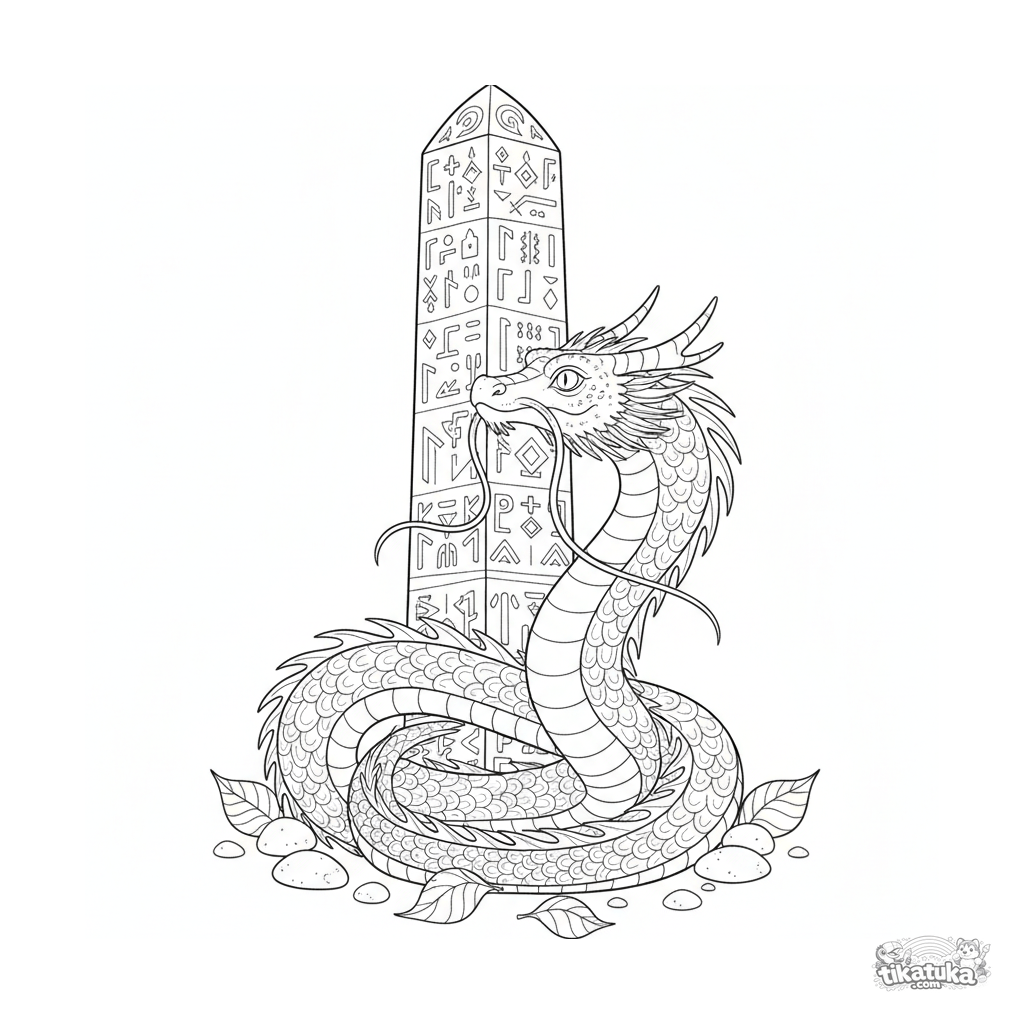 Página para colorear para 10-12 años: un dragón serpentino detallado se enrosca alrededor de un antiguo monolito rúnico. Contornos limpios, proporciones naturalistas, atmósfera de leyenda.