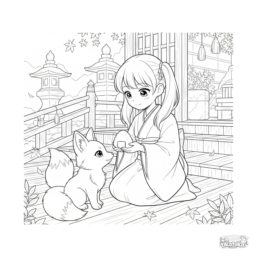 Página para colorear estilo anime para 10-12 años: una sacerdotisa alimenta a un espíritu zorro bebé en el porche de un santuario de montaña en una tarde de otoño.