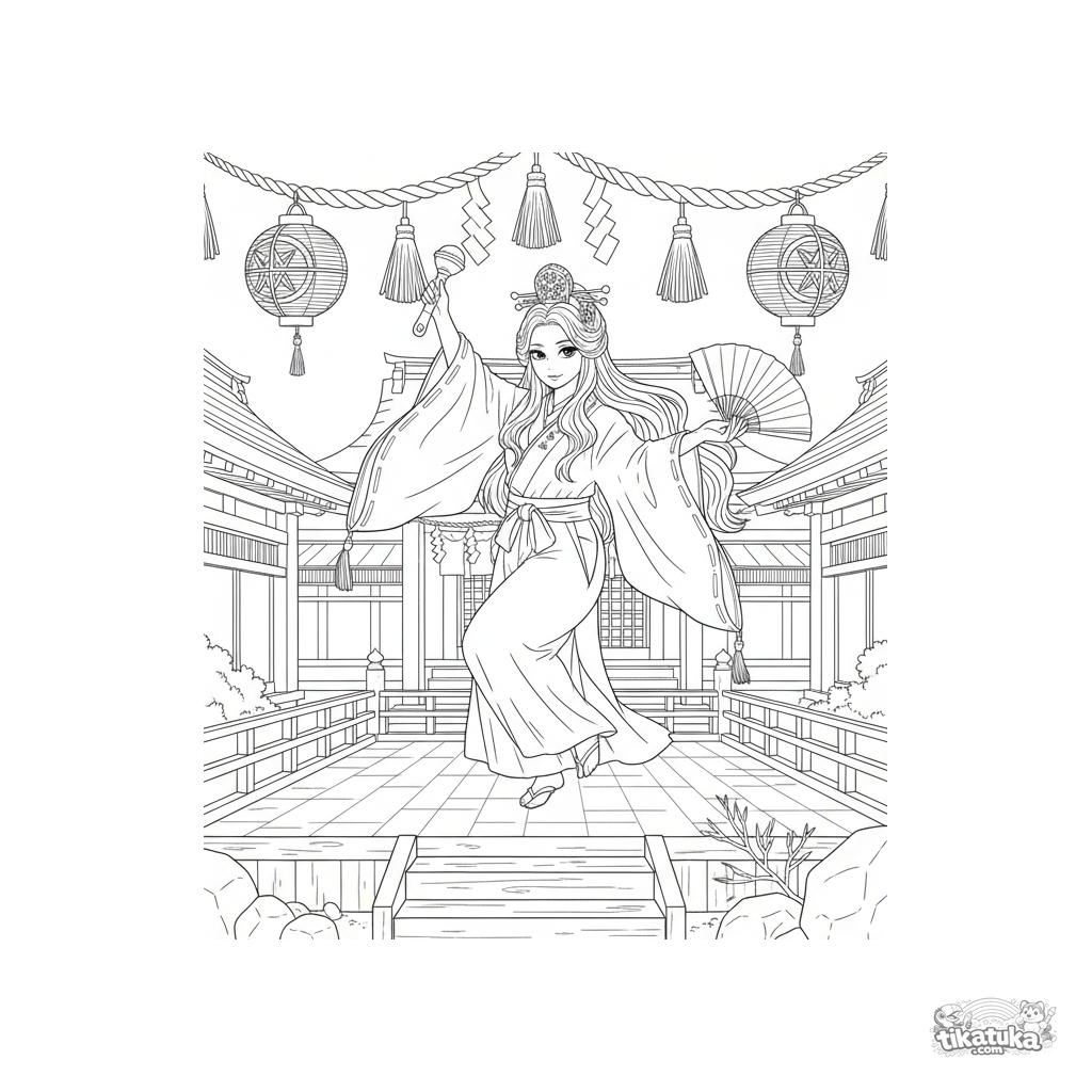 Página para colorear anime realista: una sacerdotisa realiza la danza ceremonial Kagura. Escena detallada con atuendo y decoraciones tradicionales para 10-12 años.