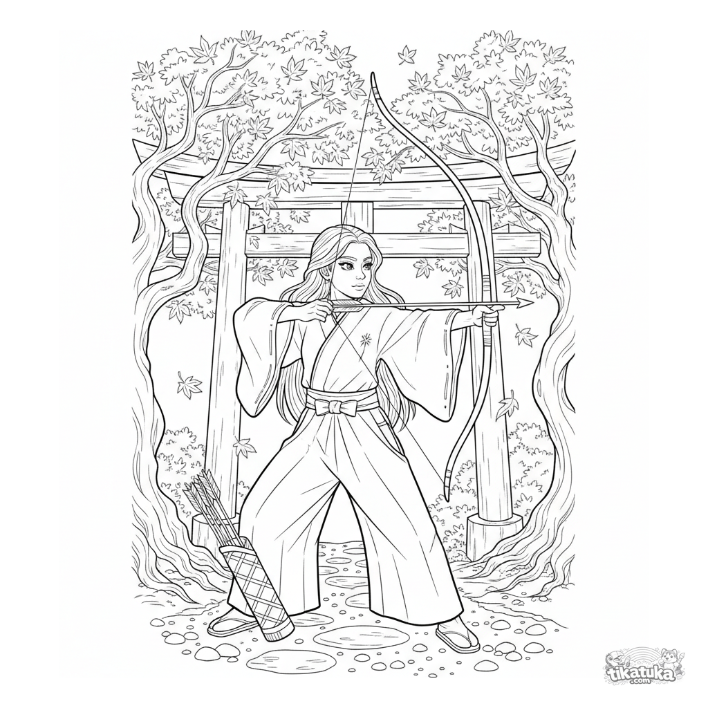 Página para colorear detallada estilo anime para 10-12 años: una sacerdotisa con vestimenta tradicional practica tiro con arco en un jardín de santuario otoñal.
