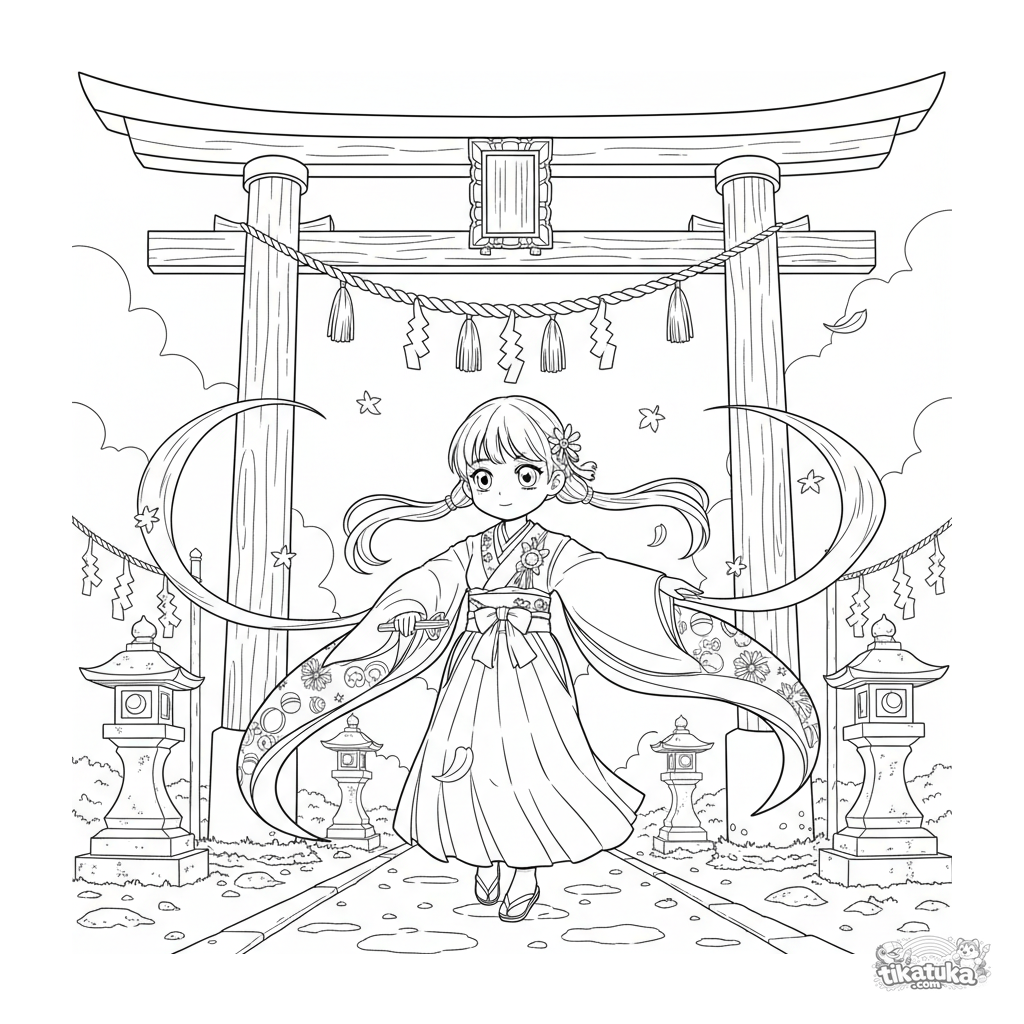 Página para colorear estilo anime para 10-12 años: una sacerdotisa realiza una danza ceremonial Kagura bajo una gran puerta torii en un santuario otoñal.