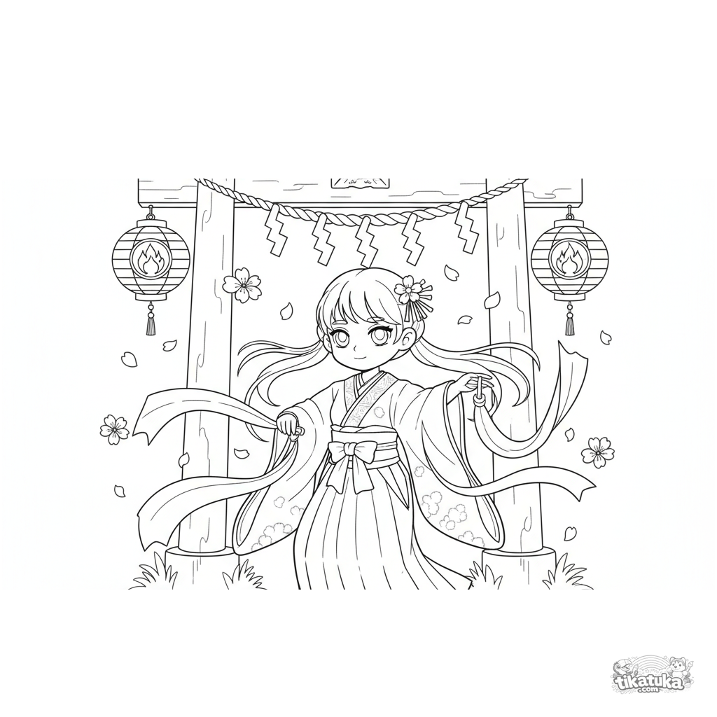Página para colorear estilo anime: una sacerdotisa realiza una danza ritual Kagura bajo puertas torii. Escena compleja y detallada para niños de 10-12 años.