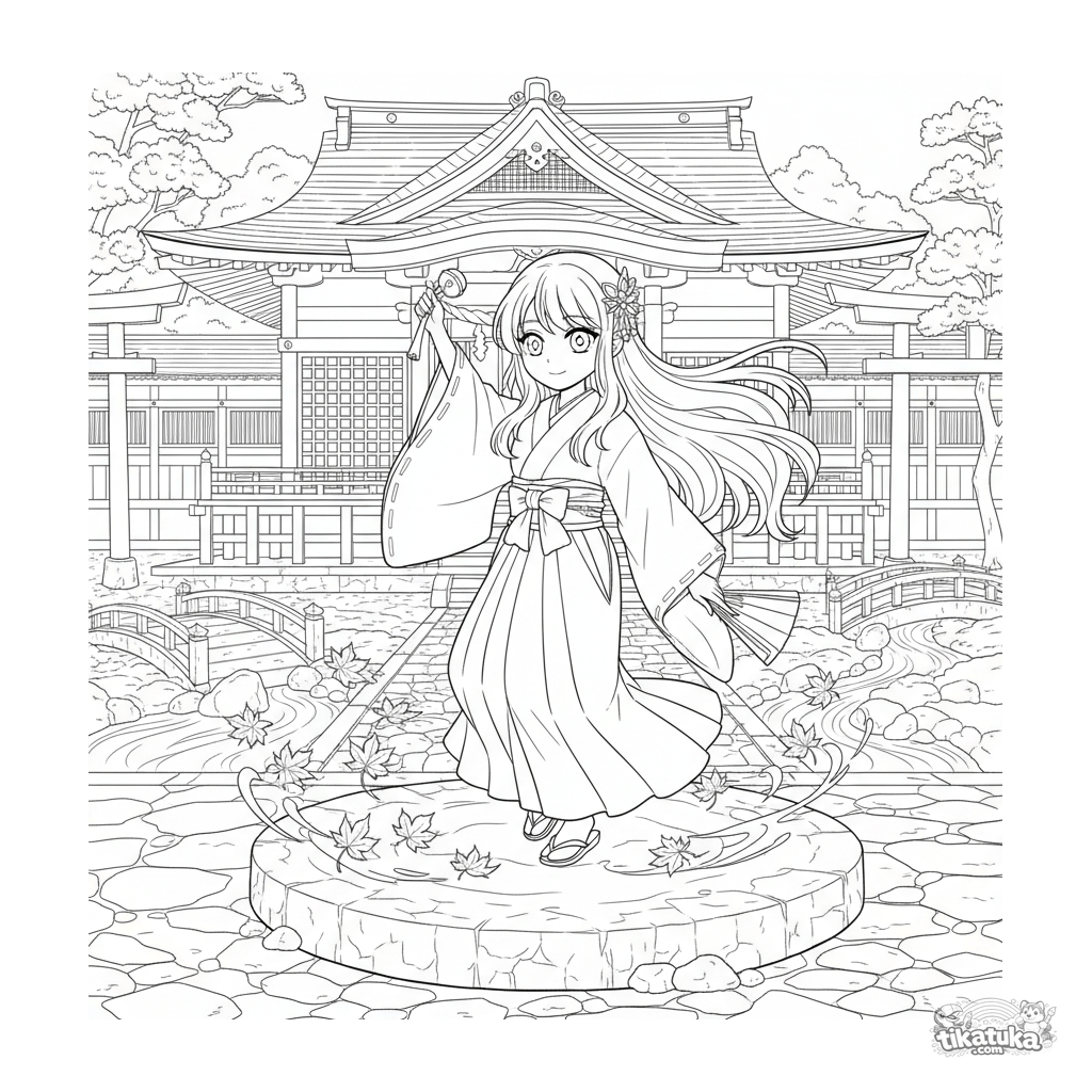 Página para colorear estilo anime: una sacerdotisa realiza una danza ceremonial Kagura en el patio de un santuario otoñal. Escena detallada para 10-12 años con fondo intrincado.