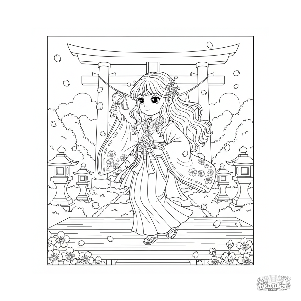 Página para colorear estilo anime: una sacerdotisa realiza una danza Kagura con campanillas ceremoniales al amanecer. Escena detallada para 10-12 años con fondo de santuario intrincado.