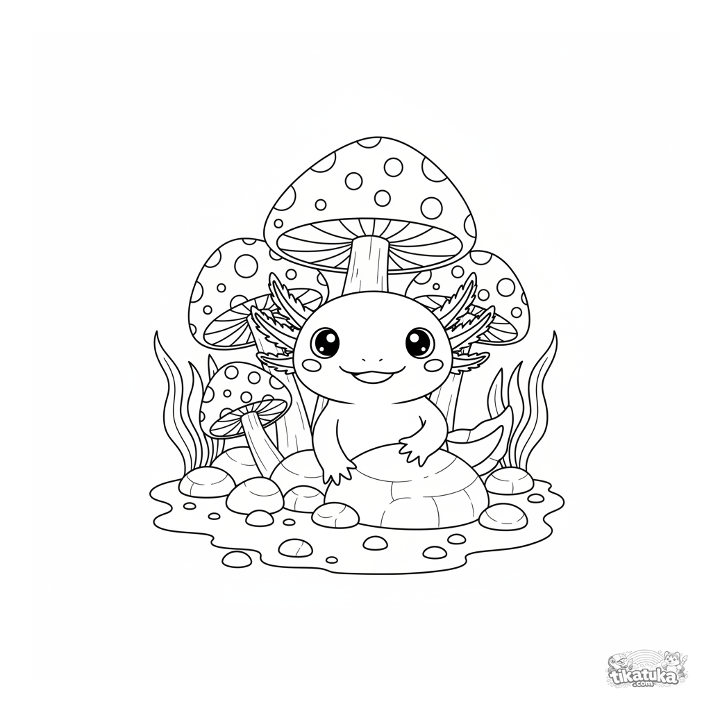 Página para colorear para niños 4-6: un ajolote tímido asoma desde detrás de hongos brillantes en un estanque con piedras. Escena submarina linda.