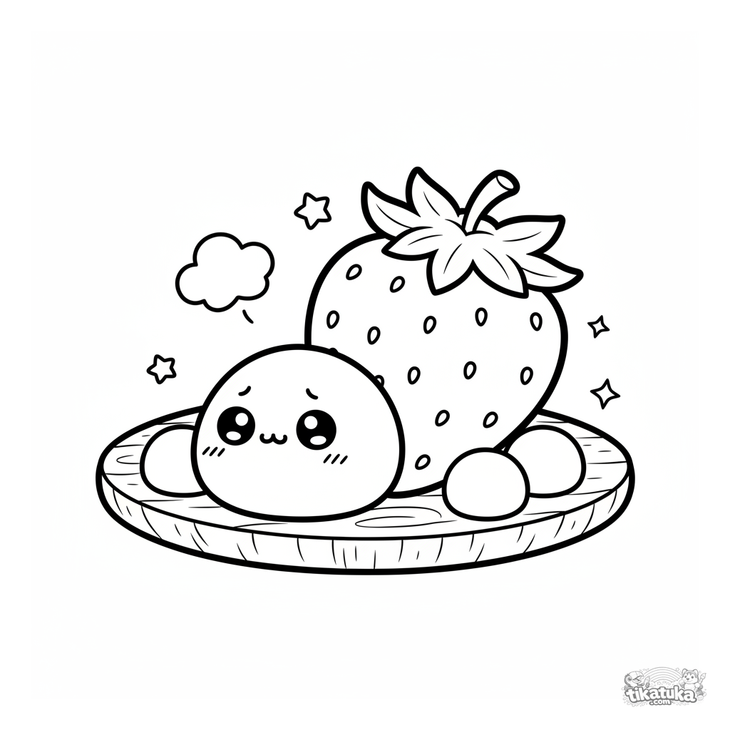 Página para colorear para niños 4-6: un lindo y tímido mochi asoma desde detrás de una fresa gigante en un plato de postre. Escena simple y adorable.