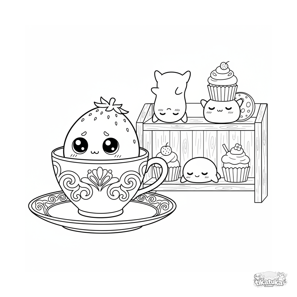 Página para colorear para niños 4-6: un mochi de fresa tímido asoma desde detrás de una taza de té en un estante de dulces. Escena tierna.
