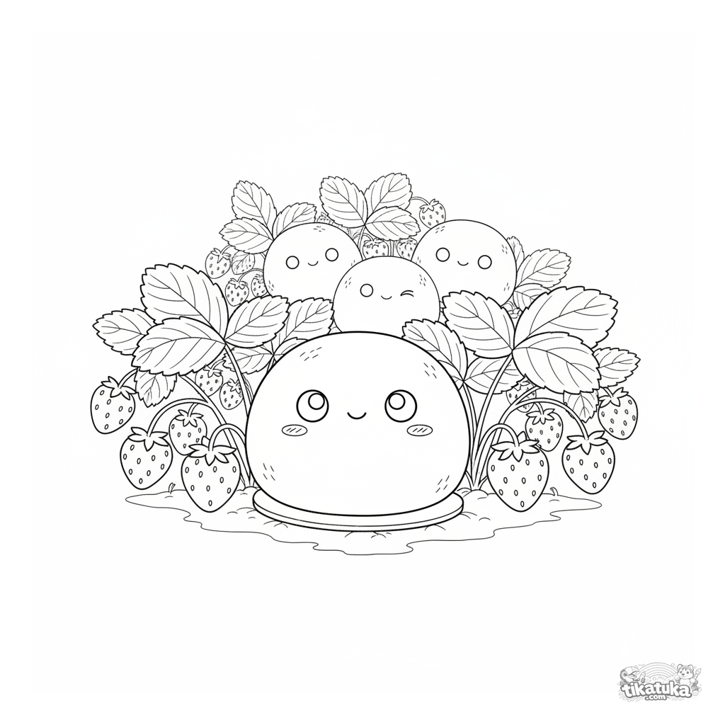 Página para colorear realista: un mochi de fresa tímido asoma entre plantas. Escena detallada para 10-12 años con hojas y frutas intrincadas.
