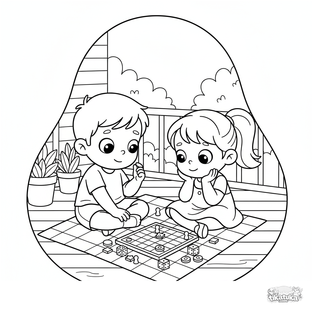 Página para colorear para niños 4-6 años: un hermano y una hermana jugando un juego de mesa en el suelo de un porche acogedor. Formas claras y ambiente amistoso.