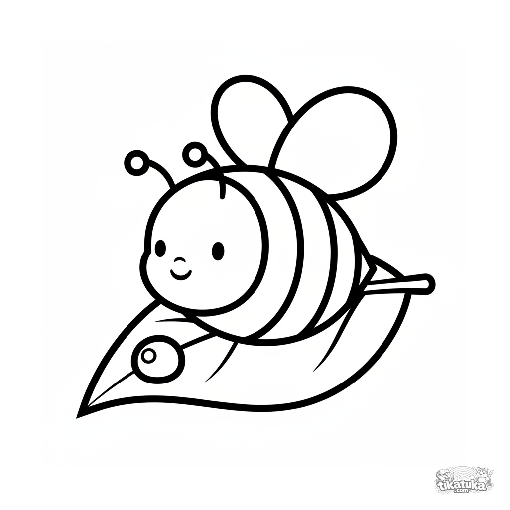 Página para colorear muy simple para niños pequeños 2-3: una linda abejita sentada en una hoja grande junto a una gota de rocío. Formas grandes y claras.