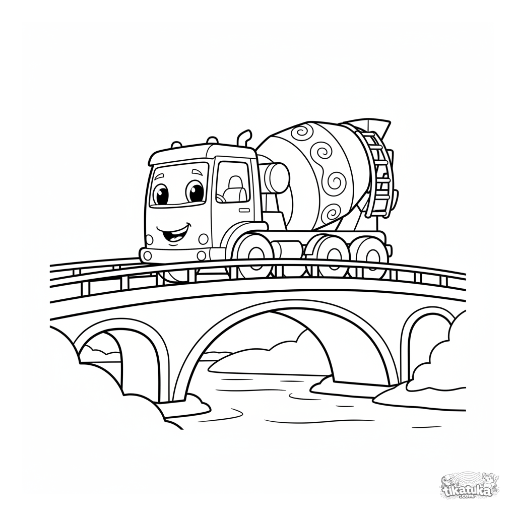 Página para colorear muy sencilla para niños pequeños 2-3: un gran camión hormigonera en un puente. Formas grandes y claras.